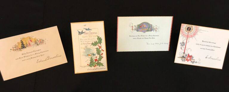 The museum has a unique collection of greeting cards that was part of a donation from the Ida Browder family. Ida Brower may be a familiar name to some, as she was the owner of Browder’s Cafe in Boulder City going back to the days of the Boulder Dam construction. Ida kept every card she was sent for more than 4 decades, and so this gives us a unique and special insight in now only how cards and their manufacture have changed over time, but it allows a peek into the history of those times, from the 1920s to the end of the 1950s.