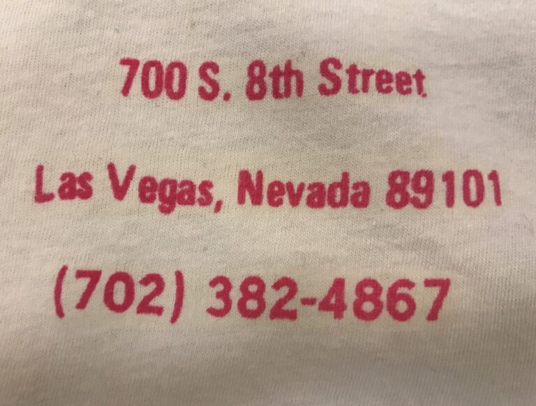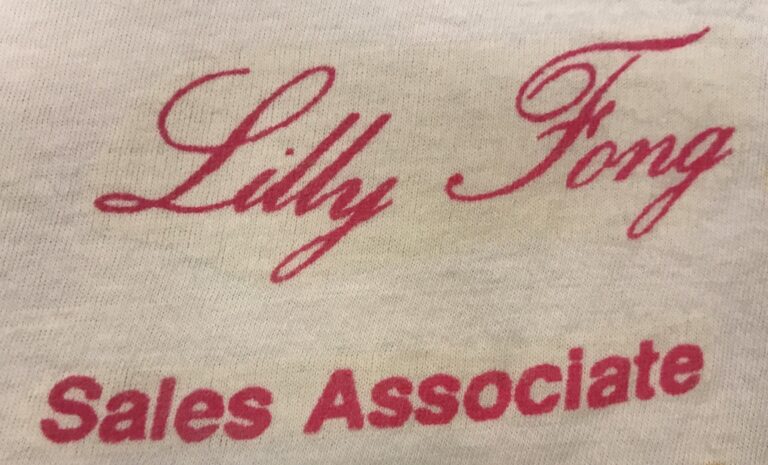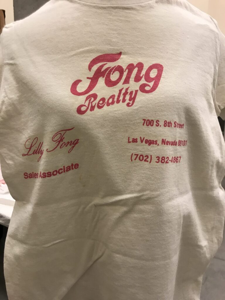 This is a white t-shirt with hot pink font that reads: “Fong Realty / Lilly Fong Sales Associate / 700 S. 8th Street Las Vegas, Nevada 89101 (702) 382-467”.