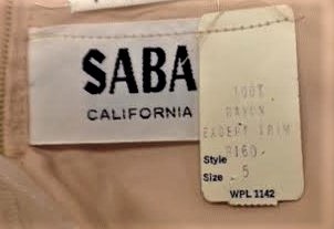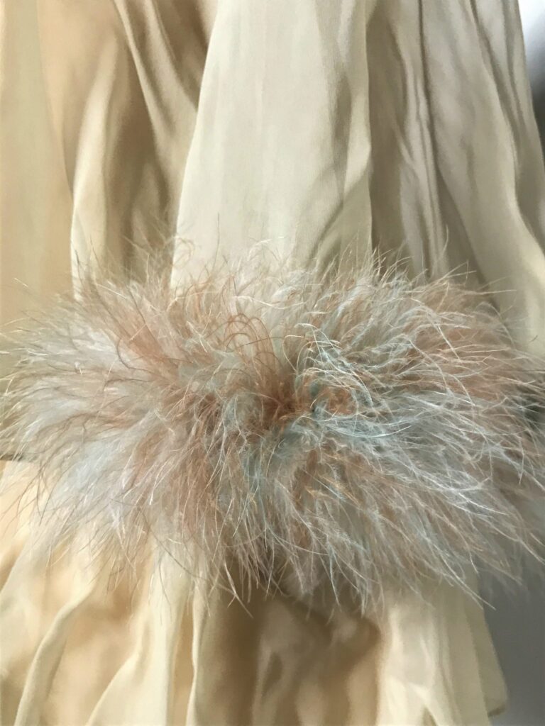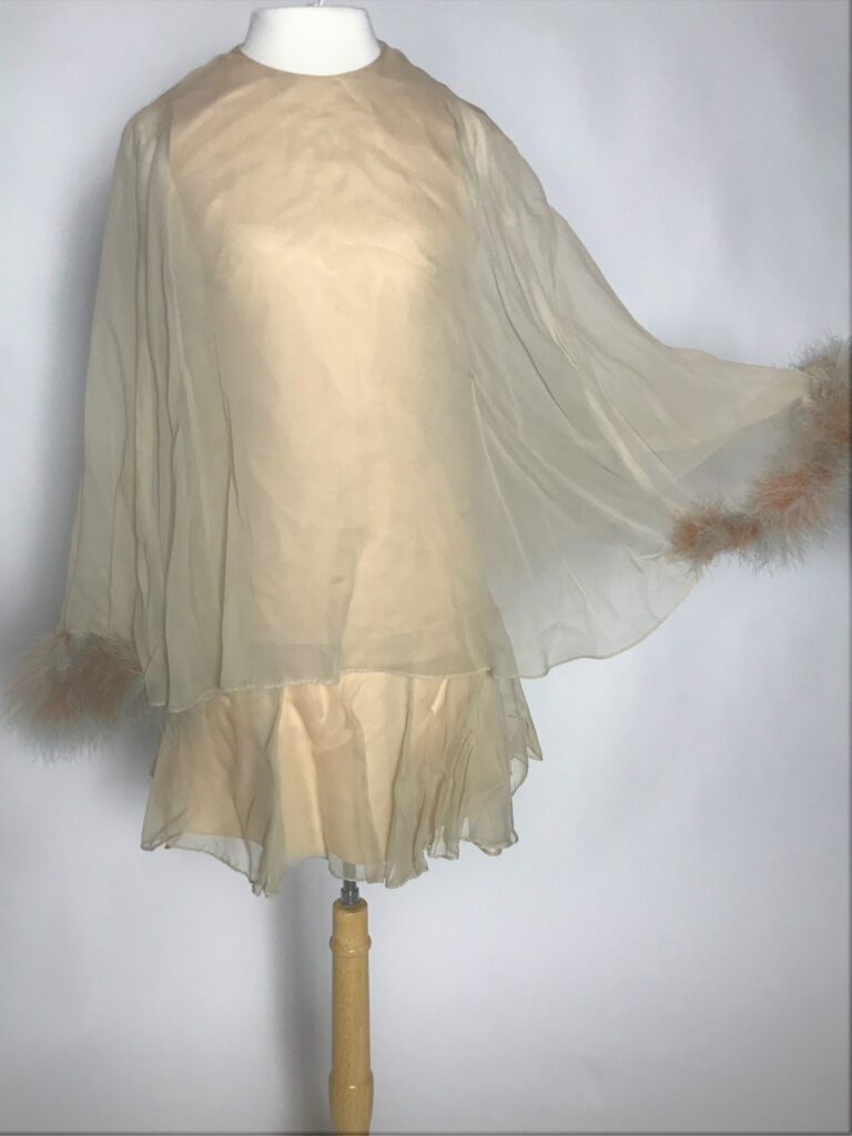 This is a nude chiffon dress composed of two parts. The main dress is a lined drop waist silk sleeveless dress with a high round neckline. Attached along the neckline and falling over the top of the main dress is a loose chiffon cape. The cape has thin matching nude and pale blue marabou feathers sewn into the edges of either side, acting like cuffs on a sleeve, where the cape would rest on the wrists. There are clasps along the edges at the back of the cape to connect it above the zip of the main dress. The brand is Saba California.